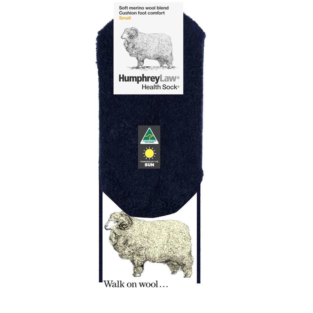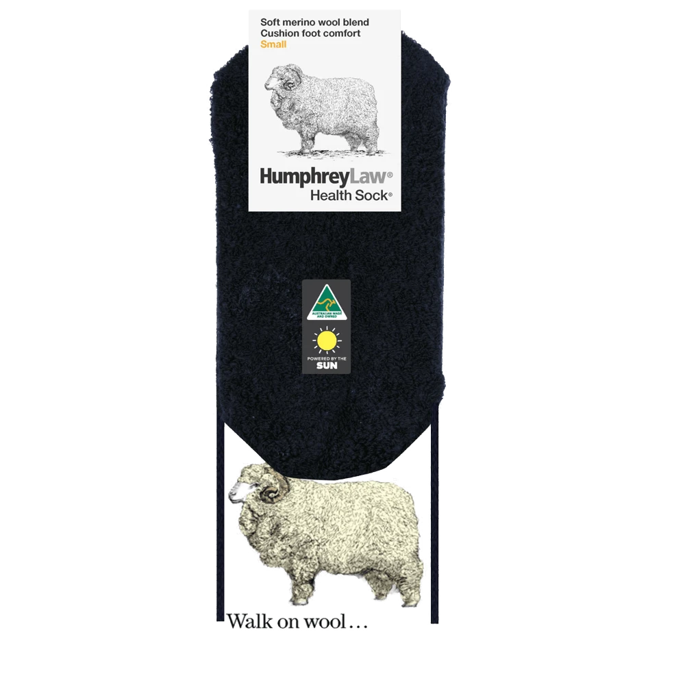 This sock has a pure fine merino wool terry-knitted cushion sole which provides extra insulation, resilience, and softness underfoot. The leg of the sock is a fine wool blend so looks like a normal fine business sock. The outside of the foot of the sock is nylon to provide longer wear. A Health Sock® with no tight elastic top.