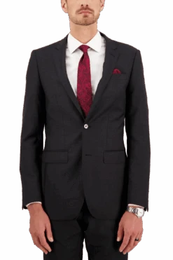 Premium charcoal suit jacket with stylish pin line check pattern. Mix and match with Jesse (slim) or Noah (tailored) trousers and a contemporary waistcoat for a dapper three-piece ensemble that’ll turn heads faster than you can say “dashing!”