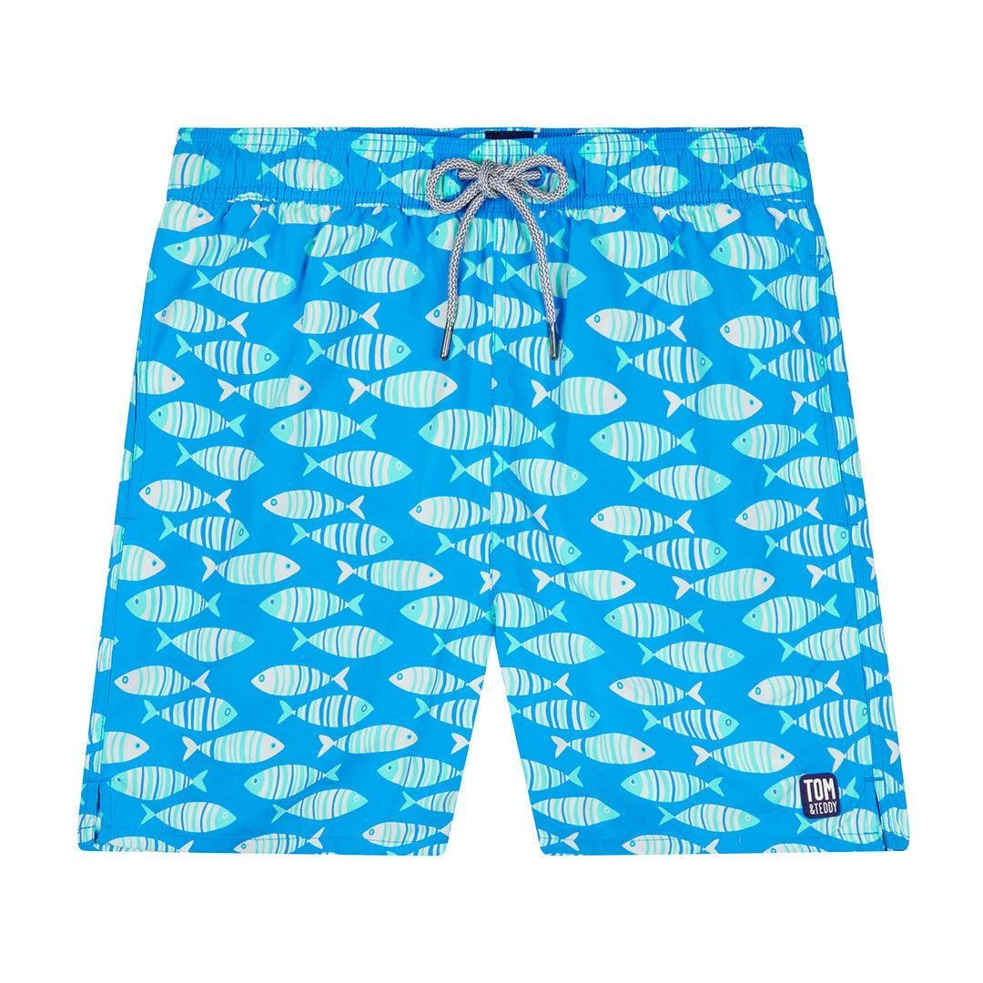 Soft & quick-drying Tom & Teddy shorts perfect for weekends, casual wear & swimming. Fish Striped Orange print pattern inner lining for support. Features two side pockets, a velcro rear pocket & a tie-up waist cord above the knee.